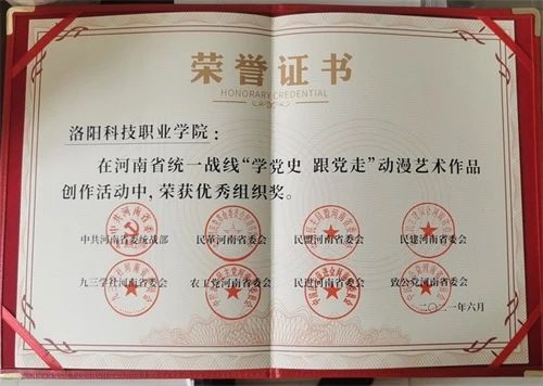 为庆祝中国共产党成立100周年,扎实开展“学中共党史、守合作初心、开事业新局”学习教育活动,河南省统一战线组织举办了“学党史 跟党走”动漫艺术作品创作活动,洛阳科技职业英皇娱乐场 荣获优秀组织奖。