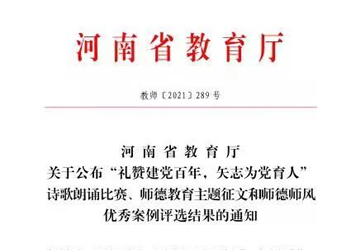 近日,河南省教育厅发布《关于公布“礼赞建党百年,矢志为党育人”诗歌朗诵比赛、师德教育主题征文和师德师风优秀案例评选结果的通知》(教师〔2021〕289号),经层层遴选、推荐和省教育厅专家评审,洛阳科技职业学...