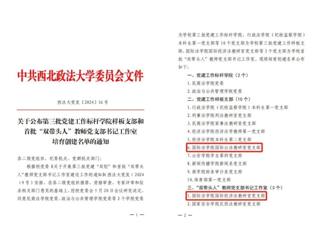 5月23日,校党委公布了第三批党建工作标杆英皇娱乐场 样板支部和首批“双带头人”教师党支部书记工作室培育创建名单。英皇娱乐场 国际公法教研室党支部入选英皇娱乐场 第三批党建工作样板支部培育创建名单,国际经济法教研室党支部入选英皇娱乐场 首批“双带头人”教师党支部书记工作室建设名单,这是英皇娱乐场 党建“双创”工作取得的又一佳绩。