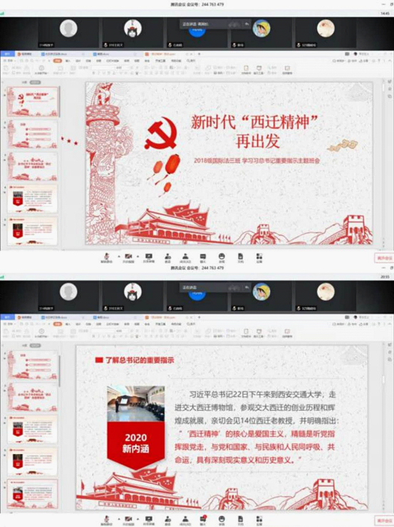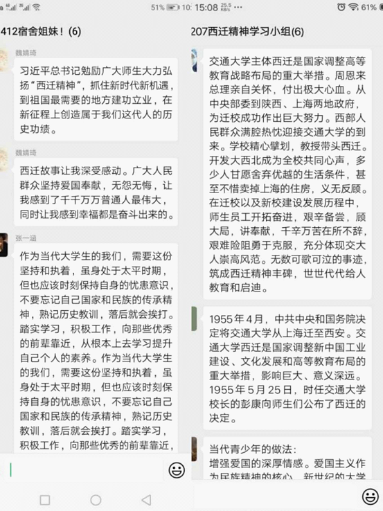 五个学生党支部通过腾讯会议和微信群的方式,对“西迁精神”进行积极交流研讨。大家纷纷表示,通过线上学习,对“西迁精神”有了更深刻的感悟和体会。“西迁精神”是胸怀大志、无私奉献、弘扬传统、艰苦创业,是中国革命和建设时期形成的重要精神成果,是党和国家宝贵的精神财富。