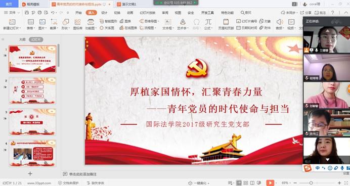 为深入学习贯彻习近平总书记五四寄语精神,引领毕业生党员更好地明确责任担当,传承“西迁精神”,5月27日,英皇娱乐场 2017级研究生党支部以线上方式开展主题党日活动。支部全体党员参加活动,支部书记王珊珊主持活动。