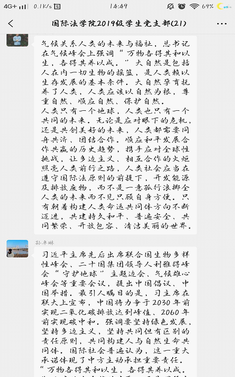 随后,支部各成员结合本专业相关知识,积极分享心得体会。大家纷纷表示,4月22日是世界地球日,也是《巴黎协定》签署纪念日,习近平总书记的发言中包含了许多与法学相关的内容,作为法学生,要重点关注讲话中提及的国际环境法、国际能源法中包含的概念,真正将所学知识与会议精神融合,并思考新时代青年对于共同构建人与自然生命共同体的责任。通过本次学习,深切感受到中国在气候治理中的担当与决心,并将以此为契机,重新审视人与自然之间的关系,树立人与自然共荣的价值理念,回顾、学习国际法中相关内容,增进对全球气候环境治理规则的认识,。