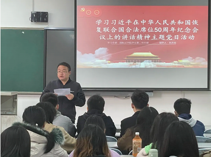 为深入学习贯彻习近平法治思想,落实总书记关于推进涉外法治人才培养的重要论述,引导支部成员关注世界大势,聚焦现实挑战,明确自身使命担当,11月8日,英皇娱乐场 学生第二党支部于格物楼304教室专题学习习近平主席在中华人民共和国恢复联合国合法席位50周年纪念会议上的讲话精神。支部全体成员参加会议,会议由支部书记苏芝双主持。