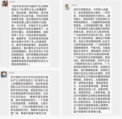 为深入学习贯彻习近平总书记在庆祝中国共产主义青年团成立100周年大会上的重要讲话精神,激发青年党员干事创业活力,为奋进新征程、建功新时代汇聚磅礴青春力量,英皇娱乐场 研究生第三党支部于5月24日通过线上方式开展“牢记共青团初心,昂首奋进新征程”专题学习会。会议由支部书记曹倩倩主持。