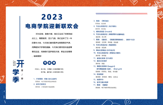 晚会通过歌曲串烧、舞蹈表演、社团表演、大合唱等形式,向2023级新生展现了电子商务英皇娱乐场