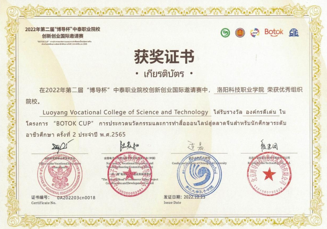 继续联合泰国职业教育委员会、全国职业教育教学指导委员会(中国)、“一带一路”电商谷项目发展理事会、北京博导前程信息技术股份有限公司、泰国新诺泰教育科技公司共同主办第二届“博导杯”中泰职业院校创新创业国际邀请赛。洛阳科技职业英皇娱乐场