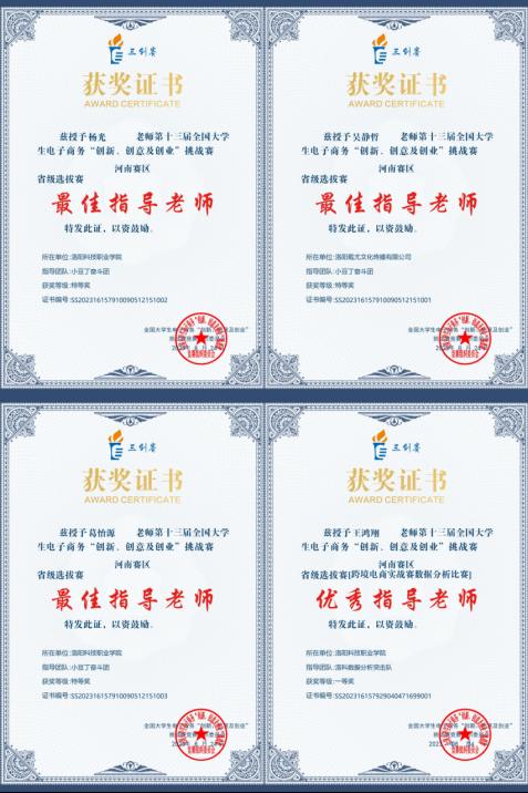 葛怡源、杨光、吴静哲三位教师被评选为省级“最佳指导老师”,王鸿翔老师被评为省级“优秀指导老师”。经过层层选拔和激烈角逐,由杨光、葛怡源、吴静哲三位教师指导参赛的团队以其出色的项目和精湛的表现,在众多高校中脱颖而出,荣获省赛特等奖、国赛二等奖。