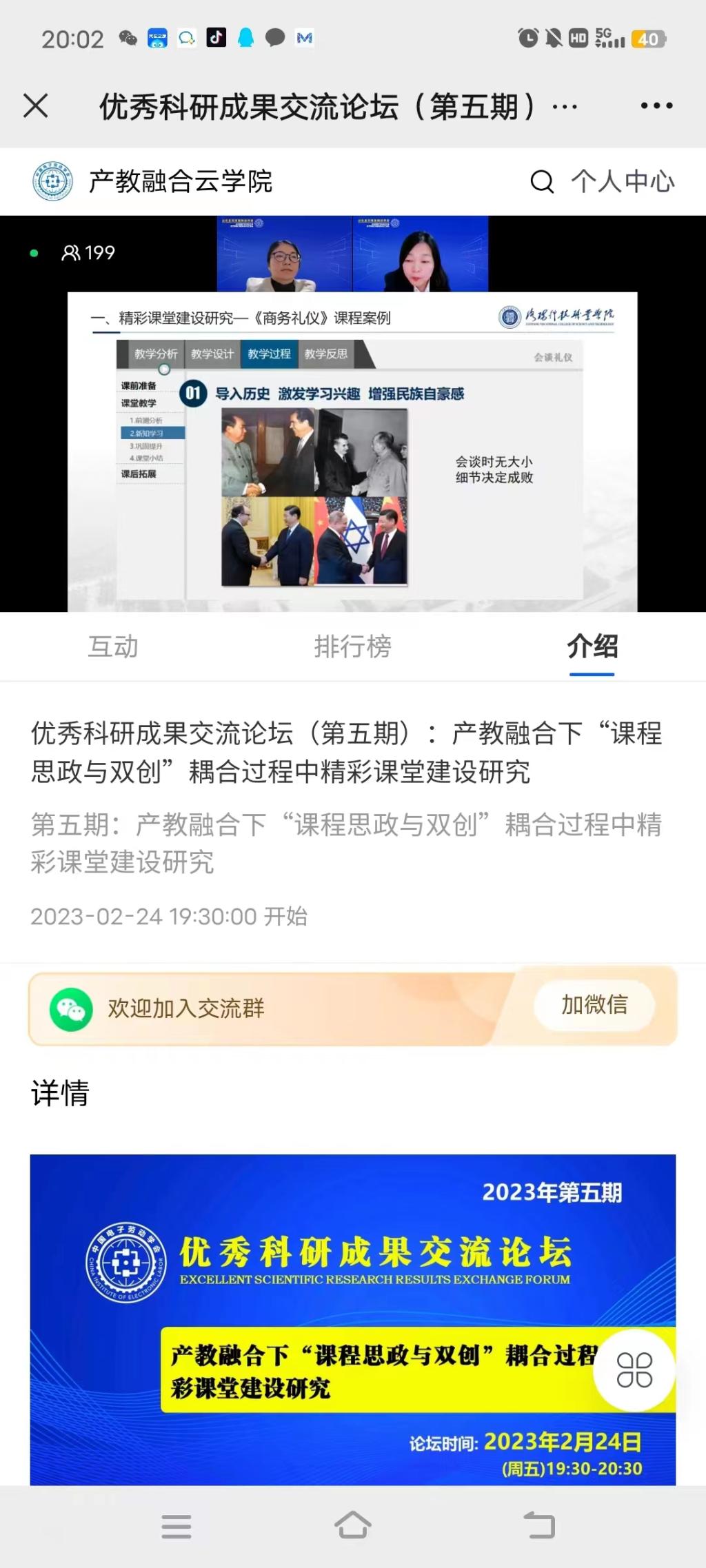 “产教融合、校企合作”教育改革发展优秀科研成果,受邀举办了一场题为《产教融合下“课程思政与双创”耦合过程中精彩课堂建设研究》的成果分享会。