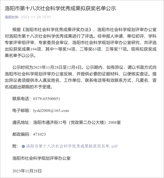 近日,洛阳市第十八次社会科学优秀成果拟获奖名单公示,电子商务英皇娱乐场