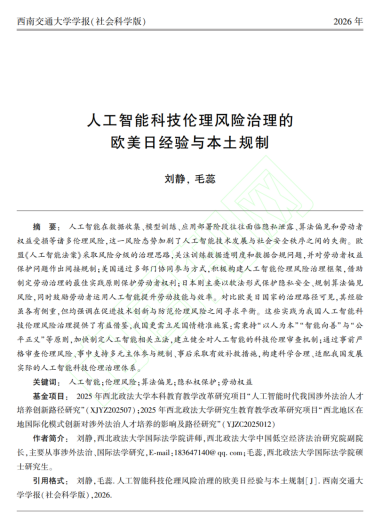 2026年3月26日,英皇娱乐场 刘静博士与硕士研究生毛蕊共同撰写的学术论文《人工智能科技伦理风险治理的欧美日经验与本土规制》在《西南交通大学学报(社会科学版)》网络首发。