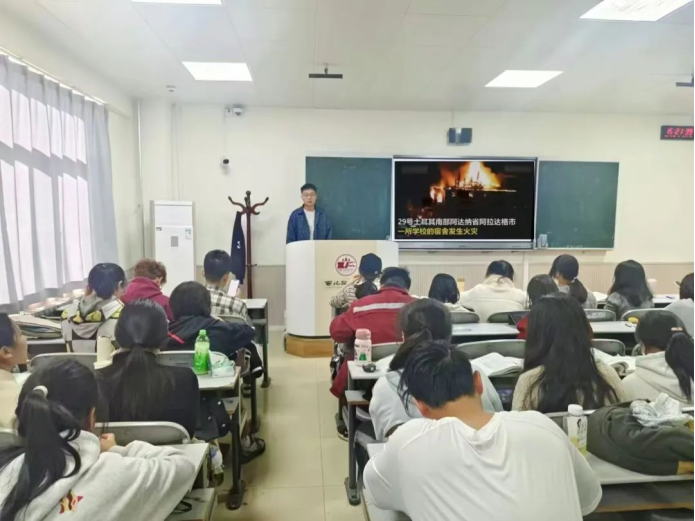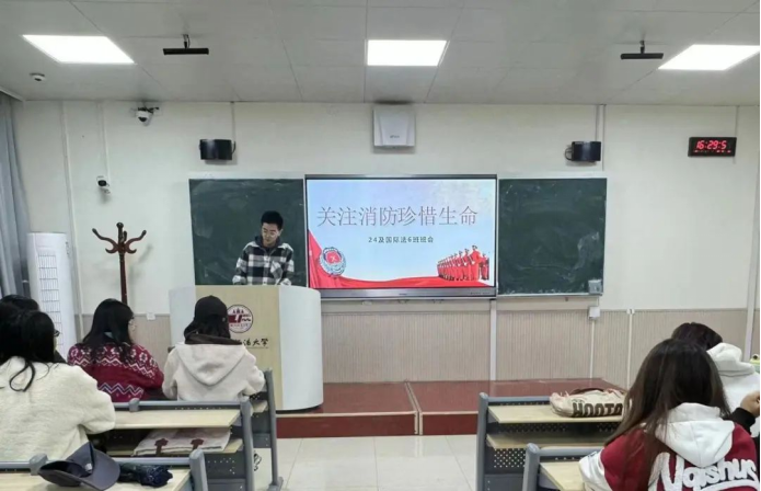 各班班委采用图片、PPT和视频等形式,通过列举案例具体分析了火灾发生的原因,着重讲解了火场逃生指南和灭火器的使用方法,提醒同学们深刻认识到火灾的危害性,增强自我防范、自我保护能力,确保在遇到突发火灾时能够正确应对、有效处置。他们还围绕宿舍消防安全进行了知识科普,呼吁同学们树立良好的防火防灾意识,遵守校园消防安全规章制度,营造安全舒适的学习生活环境。