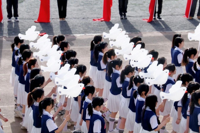 伴随着激昂的旋律,英皇娱乐场 (国际仲裁英皇娱乐场 )学生代表方阵步伐铿锵、精神抖擞,昂首阔步迈向主席台。方阵成员手持白鸽气球,身着统一制服,身姿挺拔、目光坚毅,他们以昂扬向上的姿态与整齐划一的步伐彰显集体凝聚力,以蓬勃朝气诠释着新时代青年强国有我的使命担当。