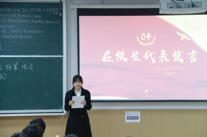 2024级学生代表何颖佳向同学们分享了个人学习与成长经验。她提到专业学习可采用“预习、互动、巩固、突击”的方法,心理层面需保持积极开放的心态。同时,她鼓励大家以竞赛为桥梁,跳出课本的局限,将理论知识转化为解决实际问题的能力,珍惜赛场的每一次挑战,找到属于自己的成长节奏与突破方向。