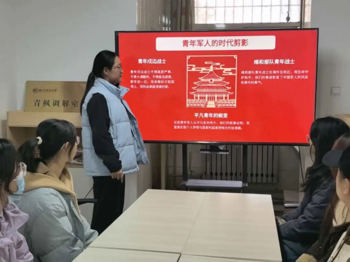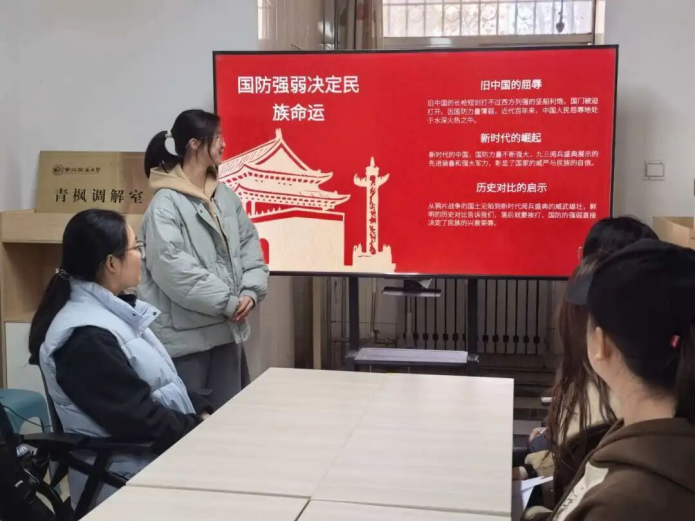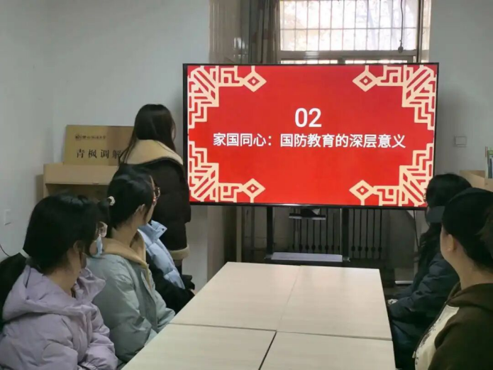 谢婉婷同学在分享中谈到,强大的国防是民族屹立不倒的脊梁,参军入伍是青春岁月中热血光荣的选择。她从“三维联动共筑国防防线”出发,生动阐释了国家安全与个人发展之间的紧密联系,让国防意识真正融入学生的精神世界。她系统介绍了国家面向大学生推出的入伍优惠政策、选拔标准与多元成长路径,并结合青年军人扎根军营、保家卫国的真实事迹,展现了新时代军人的风采,鼓励学生将爱国情怀转换为投身国防、报效祖国的实际行动。