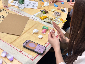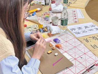 在书法体验环节,王佳旭同学为台湾学子介绍了书法的渊源发展,并选取台北故宫博物院馆藏的经典书法作品进行赏析。他在讲解书法基础技法后带领大家进行了临帖实践,并在旁细致指导、解答疑问。在黏土创作环节,周楷婷同学以泥塑为灵感,通过介绍黏土画这一艺术形式,协助大家通过捏塑台湾特色美食或心仪卡通形象,传递当地的文化符号,表达个人情感与审美趣味。