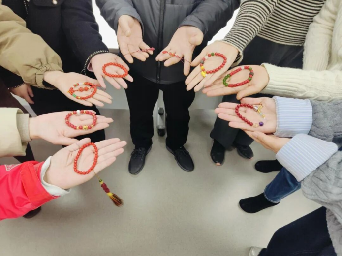 随后,活动进入核心的DIY手作环节。桌面上,规格不一的朱砂珠、雅致的隔片和配饰、结实的水晶线等材料已准备就绪。在轻松的音乐中,老师们化身“手工艺人”,精心挑选珠饰,设计搭配方案。指尖轻捻,细线穿梭,一颗颗朱砂珠被巧妙地串联起来。过程中,大家互相交流配色心得,分享串珠技巧,笑语欢声不断,现场其乐融融。不久,一条条独具匠心的朱砂手链在老师们腕间绽放光彩。那抹温暖的红色,点缀了手腕,更映照着大家脸上的成就感和愉悦笑容。老师们互相欣赏作品,拍照留念。手链“链”住的,不仅是珠串,更是此刻的轻松时光、同事情谊以及对美好生活的热爱。