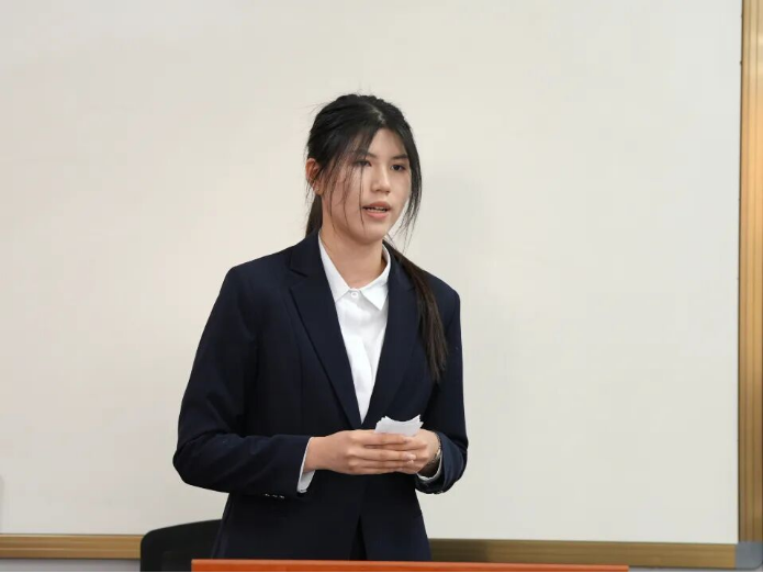 答辩开始前,黄思齐围绕“挑战杯”赛事评审标准,向各参赛团队详细介绍了本次答辩的评分要点与注意事项。她重点从项目选题的时代性、研究思路的创新性、成果应用的可行性,以及现场答辩的表达清晰度与表现力等维度进行解读,帮助参赛团队明确展示重点与答辩规范,并鼓励同学们沉着自信、充分展现风采。
