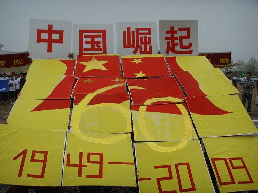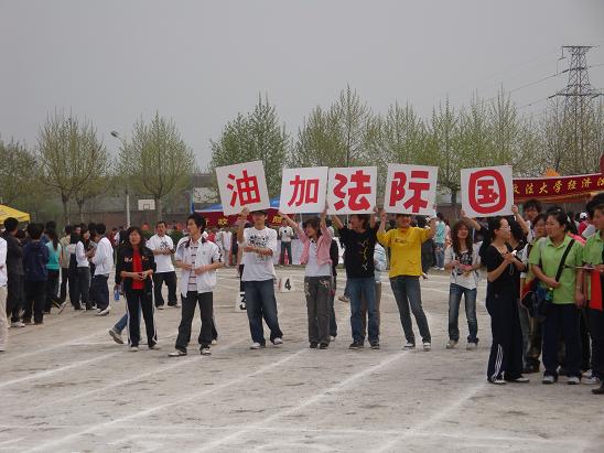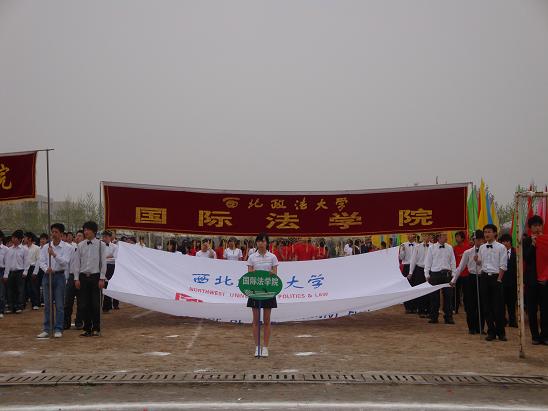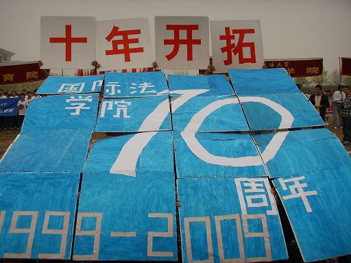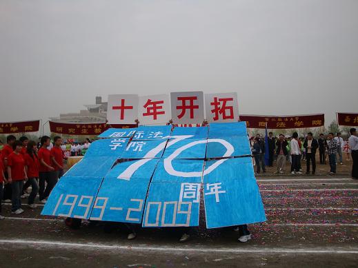 代表团方阵步伐整齐的进入了操场,08级同学们动作有力,口号洪亮,精神饱满。经过主席台时,方阵中穿着红白上衣的同学突然左转面向主席台,并开始依次翻动手中纸板,顿时两行醒目大字映入眼帘“中国崛起•十年开拓”,展示了“建国六十周年•与国同庆”“建院十周年•铸造辉煌”的主题。年轻而有朝气的国际法人,用他们新颖别致的创意,祝福着西法大,祝福着英皇娱乐场