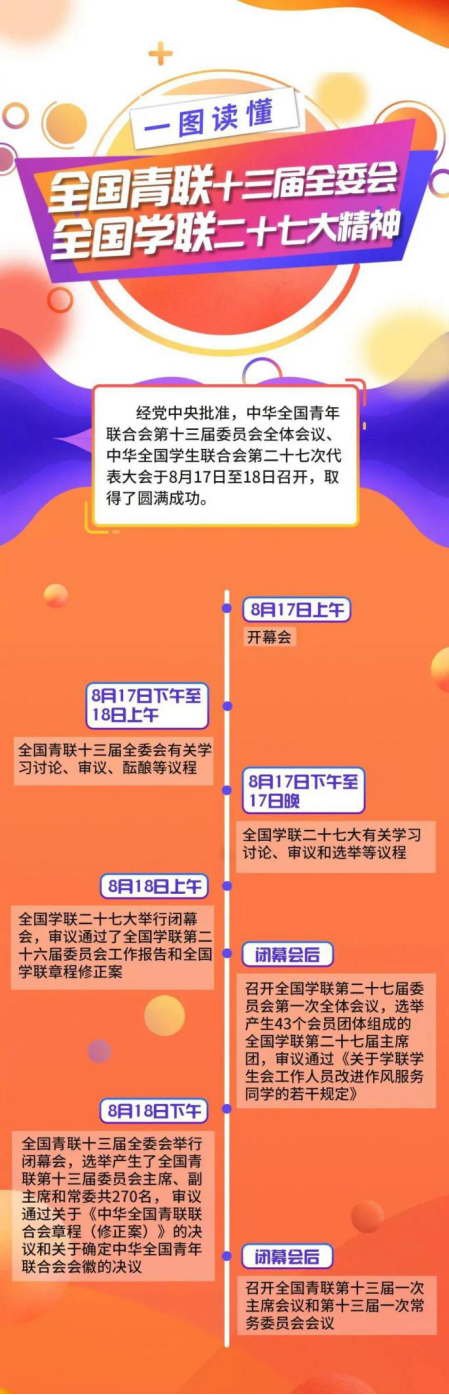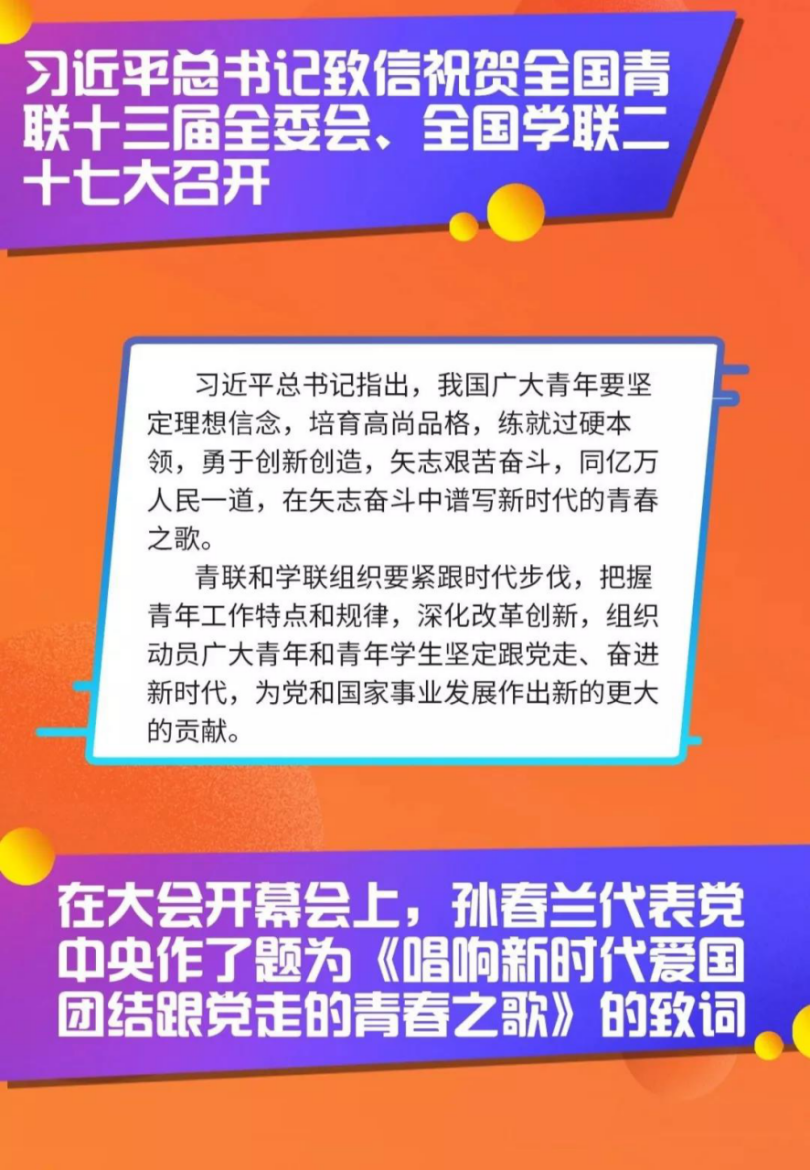 中华全国青年联合会第十三届委员会全体会议、中华全国学生联合会第二十七次代表大会于8月17日上午在京开幕。中共中央总书记、国家主席、中央军委主席习近平发来贺信,代表党中央向大会的召开表示热烈的祝贺,向全国各族各界青年和青年学生、广大海外中华青年致以诚挚的问候。