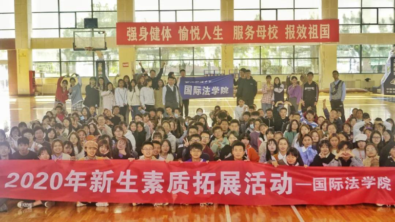 新入校园不迷茫,趣味拓展志高涨;政法国际大家庭,团结奋进梦飞翔。