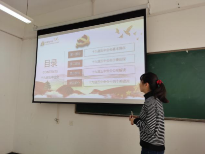 此次支部大会紧扣全会主题,宣讲核心要义,与全体共青团员面对面互动交流,全面广泛、深入生动的主题团日活动推动全会精神更加深入人心,凝聚起开启全面建设社会主义现代化国家新征程的精神力量。宋子晗从十九届五中全会基本情况入手,采用理论与实践相结合的方式,让大家更加深入的了解五中全会的具体内容,同时通过对五中全会主要议程以及公报的解读使大家更为深入的了解了国家的各项大政方针,在对大家进行思想政治教育的同时,也勉励青年学子牢记初心使命,从国家发展的大格局研究问题,把个人理想追求融入党和国家事业之中,明确人生目标,找准奋斗着力点,学好本领,潜心钻研,掌握观察和认识世界的正确方法,努力成为国家的栋梁之材。