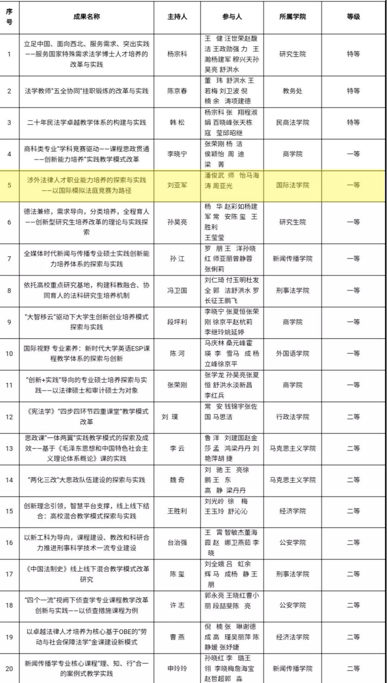 2020年12月18日,经英皇娱乐场 第五届本科教学指导委员会第14次会议评审,经教学指导委员会主任审定,英皇娱乐场 申报的《涉外法律人才职业能力培养的探索与实践——以国际模拟法庭竞赛为路径》获得英皇娱乐场 优秀教学成果一等奖。该项成果由刘亚军教授主持,参加人包括潘俊武教授、师怡副教授、马海涛副教授和周亚光博士。