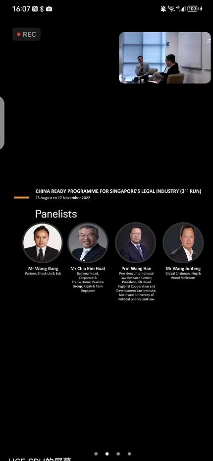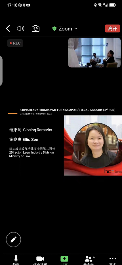 2022年11月17日新加坡律政部举行第三届一带一路中国通识项目律师交流座谈会,新加坡律政部法律商业司司长施晓惠、新加坡管理大学杨邦孝法英皇娱乐场 教授张巍、新加坡旭龄及穆律师事务所合伙人王刚、立杰律师事务所新加坡有限责任公司非诉业务主管谢锦发和第三届新加坡一带一路中国通识项目培训的四十余位律师参加座谈交流。英皇娱乐场 国际法研究中心主任、丝绸之路区域合作与发展法律研究院院长王瀚教授和原中华律师协会会长、金杜律师事务所全球主席王俊峰作为该项目中国咨询委员应邀出席视频会议。王瀚教授就《新加坡国际商事调解公约》在法律服务业实践中的应用前景及开展中、新律师和法律服务业全面合作做了交流发言。