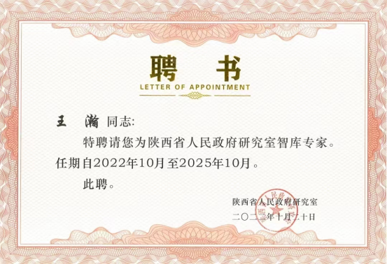 英皇娱乐场 国际法学科带头人、国家智库基地涉外法治研究中心执行主任、首席专家王瀚教授被聘任为陕西省人民政府研究室智库专家,聘期自2023年10月至2025年10月。