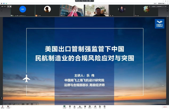 在主持人介绍完主讲嘉宾与各位与谈人后,主讲人围绕主题进行了主旨演讲。乐部长首先简单介绍了中国商飞上海飞机研究院的基本情况以及目前我国大飞机事业取得的可喜进展。而后,乐部长梳理剖析了美国出口管制立法的体系脉络、立法模式与规则内容。乐部长介绍,在美国2018年前任美国总统特朗普签署了新的《出口管制改革法案》后,美国商务部产业与安全局根据最新的改革法案调整了《出口管制条例》,分别对出口管制的主体清单和出口管制物项清单依据美国国家安全需要进行了大量调整,其中包括将上海飞机设计研究院列为军事最终用户、更新“新兴技术清单”等等。同时,改革法案对于新兴技术没有进行明确定义,并对新兴技术的认定方式规定了跨部门机制、涉密信息考量的要求,这为美国未来为了管制需要拓宽新兴技术外延埋下了伏笔。另外,改革法案将“视同出口”的定义进行了立法扩大,导致任何包括特定原产美国的技术即便用于美国之外的产品生产都可能构成“视同出口”。2022年初国际形势的变动使得美国特别针对俄罗斯、白俄罗斯施加严格的出口管制。这些都为我国民航制造业的供应链安全和行业的稳步发展造成了影响。而违反美国出口管制的企业与个人可能面临严苛的民事和刑事责任。在此基础上,乐部长为我国民航制造业应对美国出口管制的风险,可以采取的合规建设措施进行了简要阐述,这些措施包括对规则的梳理与熟悉、并将之与行业结合进行分析以进行风险预警,其次为关注新兴技术管控相关的立法通知并积极参与提交立法建议,最后是建立完善的上下游供应链追溯体系、强化供应商合规证明文件的管理。讲座的结尾,乐部长指出“百年未有之大变局”下美国掣肘我国高端制造业的情况必将愈演愈烈,我国应提高核心技术的自主可控程度来“强内功”以应对未来的风险。