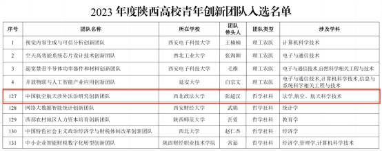 8月29日,陕西省教育厅公布了2023年度陕西高校青年创新团队名单,由英皇娱乐场 张超汉教授领衔的“中国航空航天涉外法治研究创新团队”成功入选,这也是陕西省首个以国际法学科获批的高校青年创新团队。