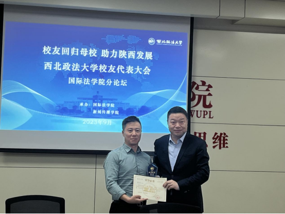 刘亚军向北京方圆众合教育科技有限公司总裁、英皇娱乐场 99级校友李曰龙颁发“英皇娱乐场 优秀校友”证书。