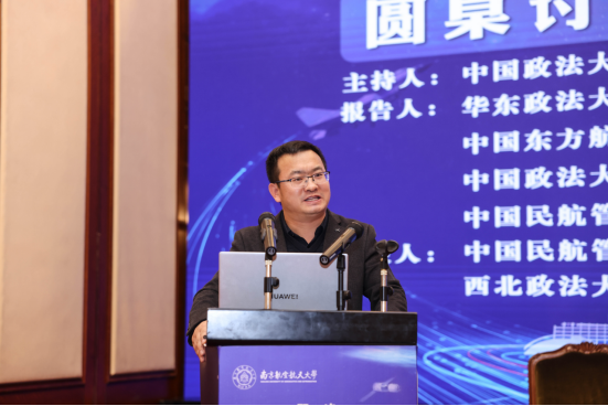 在下午的“航空法治现代化”专题圆桌讨论阶段,张超汉教授分别对中国政法大学孔得建副教授有关“临近空间的法律适用”的发言、中国民航管理干部学李磊博士有关“国际航空碳减排的路径选择与中国应对”的发言进行评议。