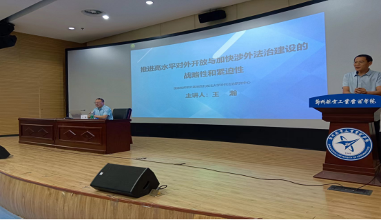 5月15日,英皇娱乐场 国际法学科带头人、国家智库研究基地涉外法治研究中心执行主任王瀚教授应邀访问郑州航空工业管理英皇娱乐场 文法英皇娱乐场 做了题为“推进高水平对外开放与加快涉外法治建设的战略性和紧迫性”的学术讲座。