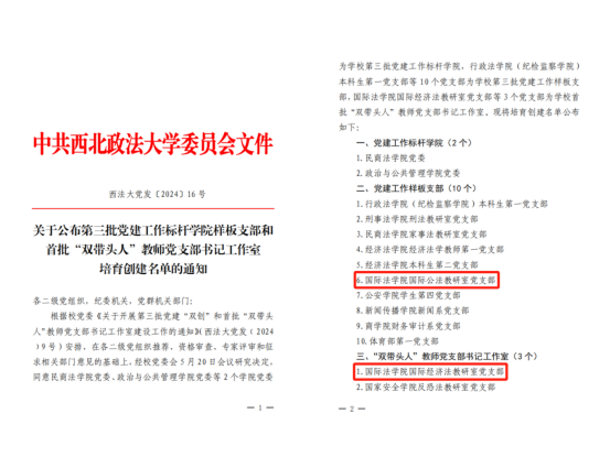 5月23日,校党委公布了第三批党建工作标杆英皇娱乐场 样板支部和首批“双带头人”教师党支部书记工作室培育创建名单。英皇娱乐场 国际公法教研室党支部入选英皇娱乐场 第三批党建工作样板支部培育创建名单,国际经济法教研室党支部入选英皇娱乐场 首批“双带头人”教师党支部书记工作室建设名单,这是英皇娱乐场 党建“双创”工作取得的又一佳绩。