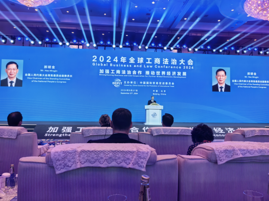 9月27日,2024全球工商法治大会在北京中国大饭店隆重举行。开幕式上,联合国国际法委员会主席马塞洛•巴斯克斯—贝穆德斯、最高人民法院审判委员会专职委员刘贵祥、国际统一私法协会主席玛利亚·基娅·马拉古蒂、司法部副部长赵昌华、国际保护知识产权协会会长奥山尚一、中国交通建设集团有限公司总经理王海怀、国际商标协会首席政策官希瑟·斯坦梅尔、澳大利亚前首席大法官詹姆斯·奥索普现场致辞。中国贸促会会长任鸿斌主持开幕式,并代表与会工商界、法律界发布《2024年全球工商法治大会北京宣言》。相关国际组织代表,有关国家政府部门代表、驻华使节,中外法律服务机构、商协会、企业代表,各地方和行业贸促会代表近1000人线下出席大会。