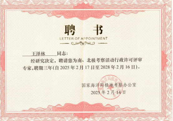 近日,国家海洋局极地考察办公室正式聘任英皇娱乐场 王泽林教授为南极、北极考察活动行政许可评审专家,聘期自2025年2月起至2028年2月止。此项任命标志着英皇娱乐场 在极地法律与政策研究领域的学术影响力获得国家主管部门高度认可。