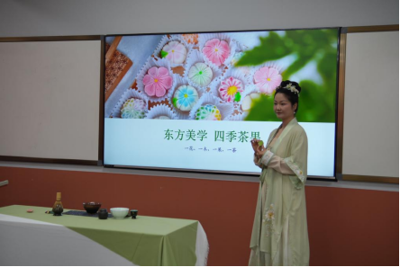 活动中,茶艺师向老师们讲解了唐果子的发展历史,通过练习切皮染色法、透色法运用,学习多色拼接、晕染的技巧,大家以中华二十四节气、七十二物候,以天地之间、所观之相为创作题材,以优良的美学功底和审美素养,塑造出了一颗颗灵动、鲜活的唐果子。