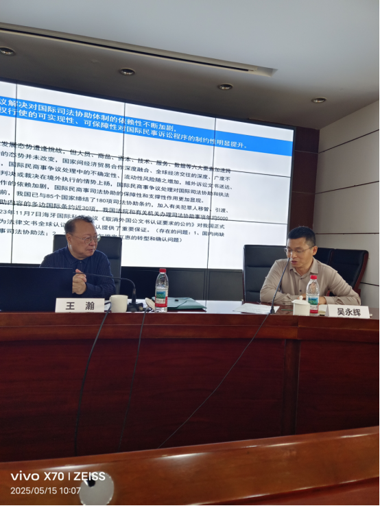 在与谈环节,吴永辉表示,王瀚教授以其亲身经历入手,从微观与宏观两个层面解读了国际民商事争议解决以及涉外法律服务业的新发展,并从分析我国在该领域的优势与不足,对培养高素质涉外法律人才具有极高的指导价值。