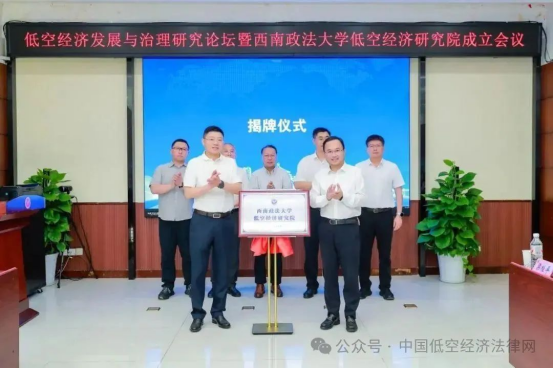 西南政法大学林维校长与重庆市委军民融合办相关负责人共同为西南政法大学低空经济研究院揭牌,重庆市政协提案委专职副主任侯东德,重庆市梁平区委常委、区委政法委书记徐勇,民航重庆安全监督管理局原局长、重庆市现代航空经济研究院研究员邓晓帆,中国低空经济法治研究院院长王瀚共同见证。