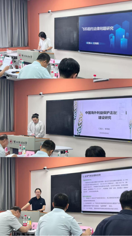 在答辩环节,各位答辩同学分别从研究背景、理论与实践价值、已有研究成果、论文框架和重难点问题等角度展开论述,其中,樊雪以《国际投资协定中的气候话语表达及其适用研究》为题,深入探讨了国际投资协定中气候话语表达的现状、问题及适用路径;李雨默以《中国海外利益保护法治安全链建设研究》为题,以法治安全链为视角分析了中国海外利益保护的现状与挑战,并提出了优化方案;王海茜以《飞机租约法律问题研究》为题,系统分析了飞机租约中的法律问题。