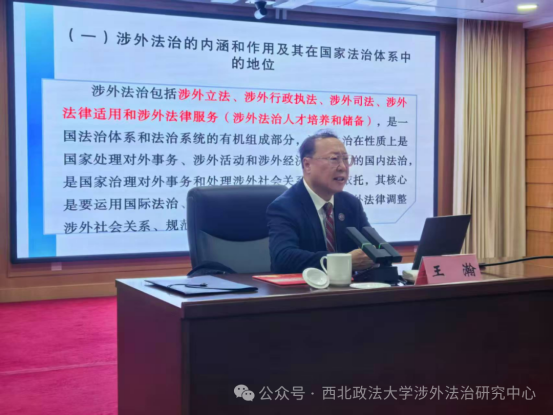 报告中,王瀚教授以《推进高水平对外开放与加快涉外法治建设的战略性和紧迫性》为题,深入解读了习近平法治思想特别是习近平总书记关于加强涉外法治工作的重要论述,深刻剖析对外开放与涉外法治的互动规律和交互影响,详细阐明加快推进涉外法治建设的战略性、紧迫性及总体工作布局,为加快推进涉外法治建设、实现高水平对外开放提供理论支撑。