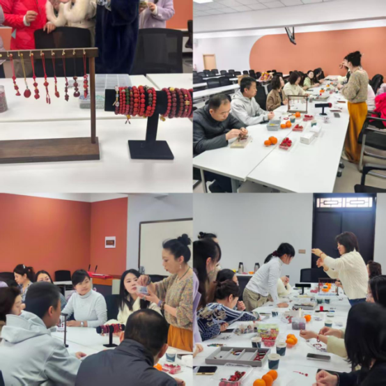 随后,活动进入核心的DIY手作环节。桌面上,规格不一的朱砂珠、雅致的隔片和配饰、结实的水晶线等材料已准备就绪。在轻松的音乐中,老师们化身“手工艺人”,精心挑选珠饰,设计搭配方案。指尖轻捻,细线穿梭,一颗颗朱砂珠被巧妙地串联起来。过程中,大家互相交流配色心得,分享串珠技巧,笑语欢声不断,现场其乐融融。不久,一条条独具匠心的朱砂手链在老师们腕间绽放光彩。那抹温暖的红色,点缀了手腕,更映照着大家脸上的成就感和愉悦笑容。老师们互相欣赏作品,拍照留念。手链“链”住的,不仅是珠串,更是此刻的轻松时光、同事情谊以及对美好生活的热爱。