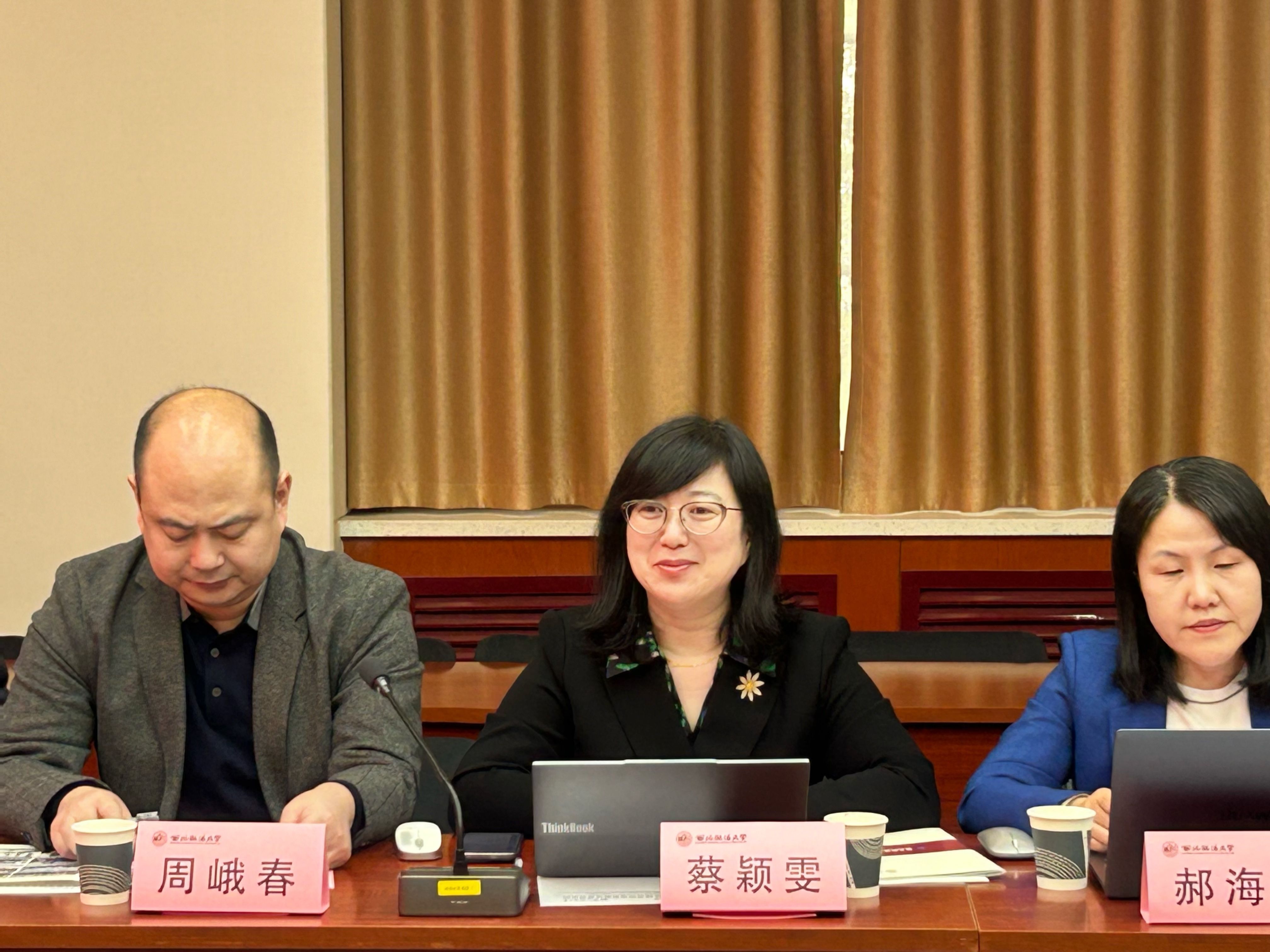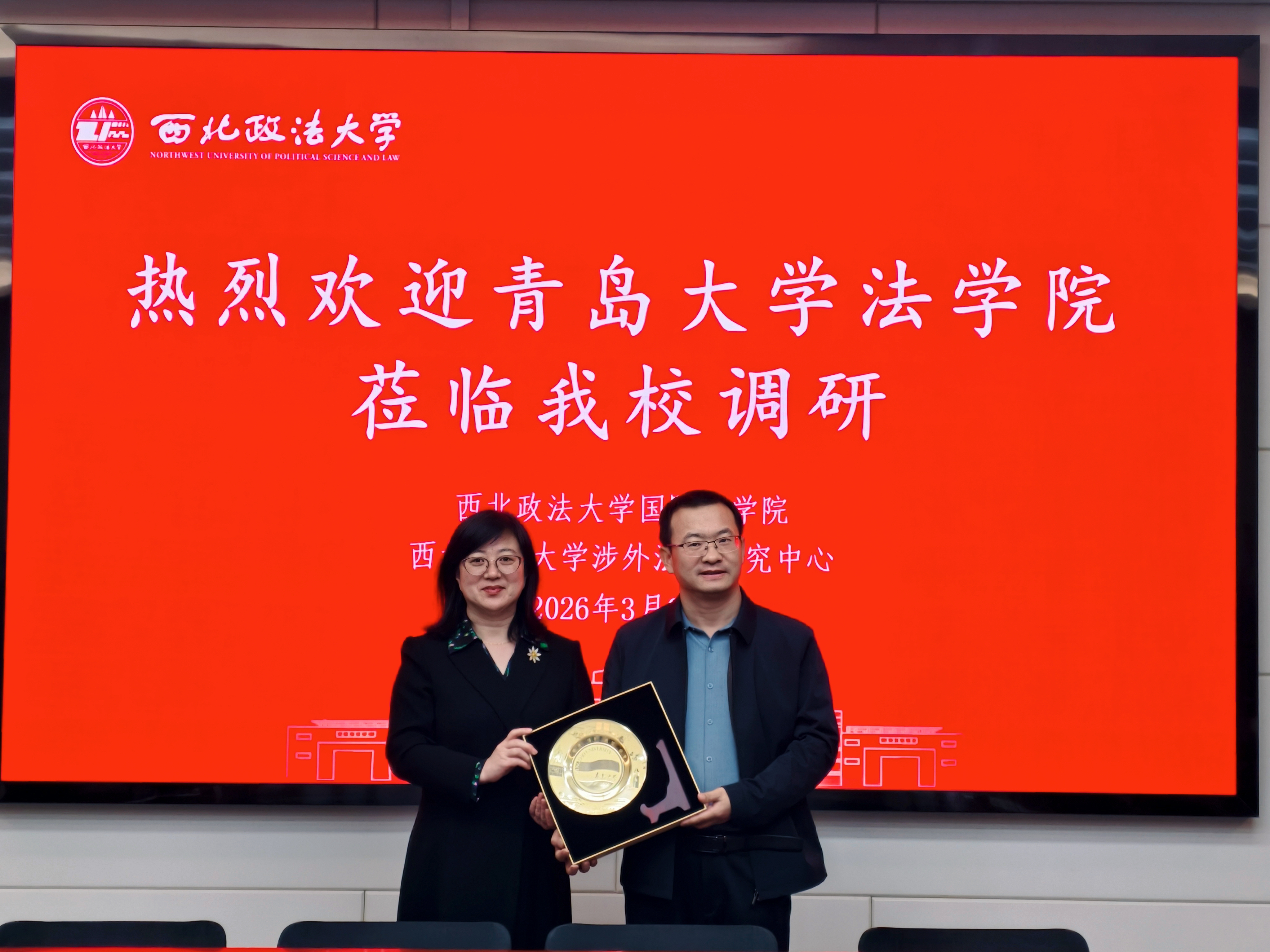 会议结束,蔡颖雯院长代表青岛大学法英皇娱乐场 向英皇娱乐场 赠送纪念品,并与英皇娱乐场 院长张超汉合影留念。