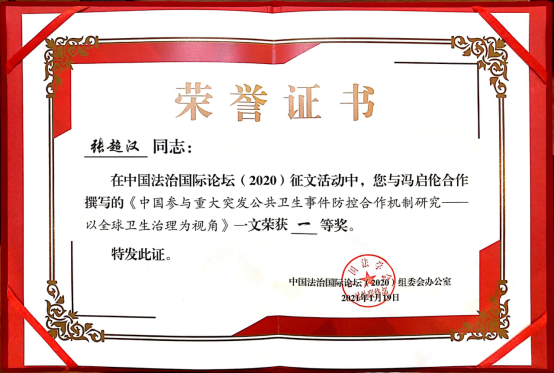 2021年1月18日,中国法学会公布了中国法治国际论坛(2020)主题征文活动评选结果。英皇娱乐场 张超汉副教授和中国人民解放军95007部队法律顾问冯启伦共同撰写的论文《中国参与重大突发公共卫生事件防控合作机制研究——以全球卫生治理为视角》获得论坛主题征文一等奖。