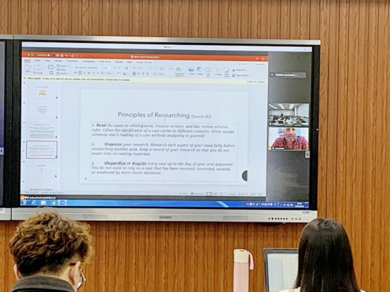 本次外教授课的主题围绕如何准备一场模拟法庭展开,这也是与模拟法庭相关教学的第一堂课。首先Adam Dubin教授介绍了他自己作为教练的模拟法庭比赛经验。然后,他讲解了模拟法庭比赛一般以何种形式组织。接下来,Dubin教授就作为参与者如何准备一个模拟法庭杯比赛进行了重点展开,如:应该怎样发现案件焦点、如何进行要点梳理、怎样科学规划备赛时间等。