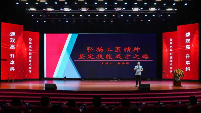 作为“95后”的技能人才,杨登辉用自己的实际行动诠释了如何实现技能报国,并从三个维度分享了自己的成长轨迹。首先,他向青年学子们讲述了自己如何从一名普通技校生成长为站在世界技能大赛巅峰的冠军,用一技之长为国争光,实现了技能报国的梦想;其次,作为世赛选手转型为竞赛教练,他不仅将世界技能大赛的先进理念、技术标准及评价体系融入技能人才培养,更肩负技艺传承的重任,引领学生学习并掌握最新、最前沿的技术,成功培育出众多信念坚定、脚踏实地的高素质技能人才,为职业技术教育赢得荣誉;再者,作为全国人大代表,他积极为技工教育的高质量发展出谋划策,勇于在新时代新征程中探索前行,作出了新的贡献,续写了辉煌篇章,充分体现了为国履职、为民尽责的崇高责任感。报告尾声,杨登辉勉励洛科学子要专注于技艺精进,不忘初心,追求卓越,以期在未来能够出类拔萃,为国争光。
