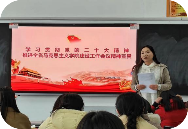 她指出,全体教师应同向发力,同行共进,为争创河南省示范性马院而砥砺奋发。另外,全体教师应促进第一课堂和第二课堂融合发展,用好课堂教学主渠道,筑牢意识形态主阵地;建好用好思政课实践教学基地,增强课程的时代感和学生的参与感。同时,英皇娱乐场 将运用各类载体和形式,广泛开展宣传教育,营造学习贯彻党的二十大精神的浓厚氛围,奋力推动党的二十大精神全面贯彻落实。