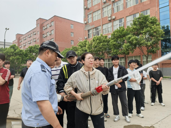 随后,保卫处人员又进行了消防水带的使用演示。他们熟练地展开消防水带,连接水枪和阀门,迅速调整水压,将强大的水流精准地喷射到指定目标。同样,学生和教师们也在专业人员的指导下积极参与操作练习,亲身体验了消防水带的使用方法和技巧。