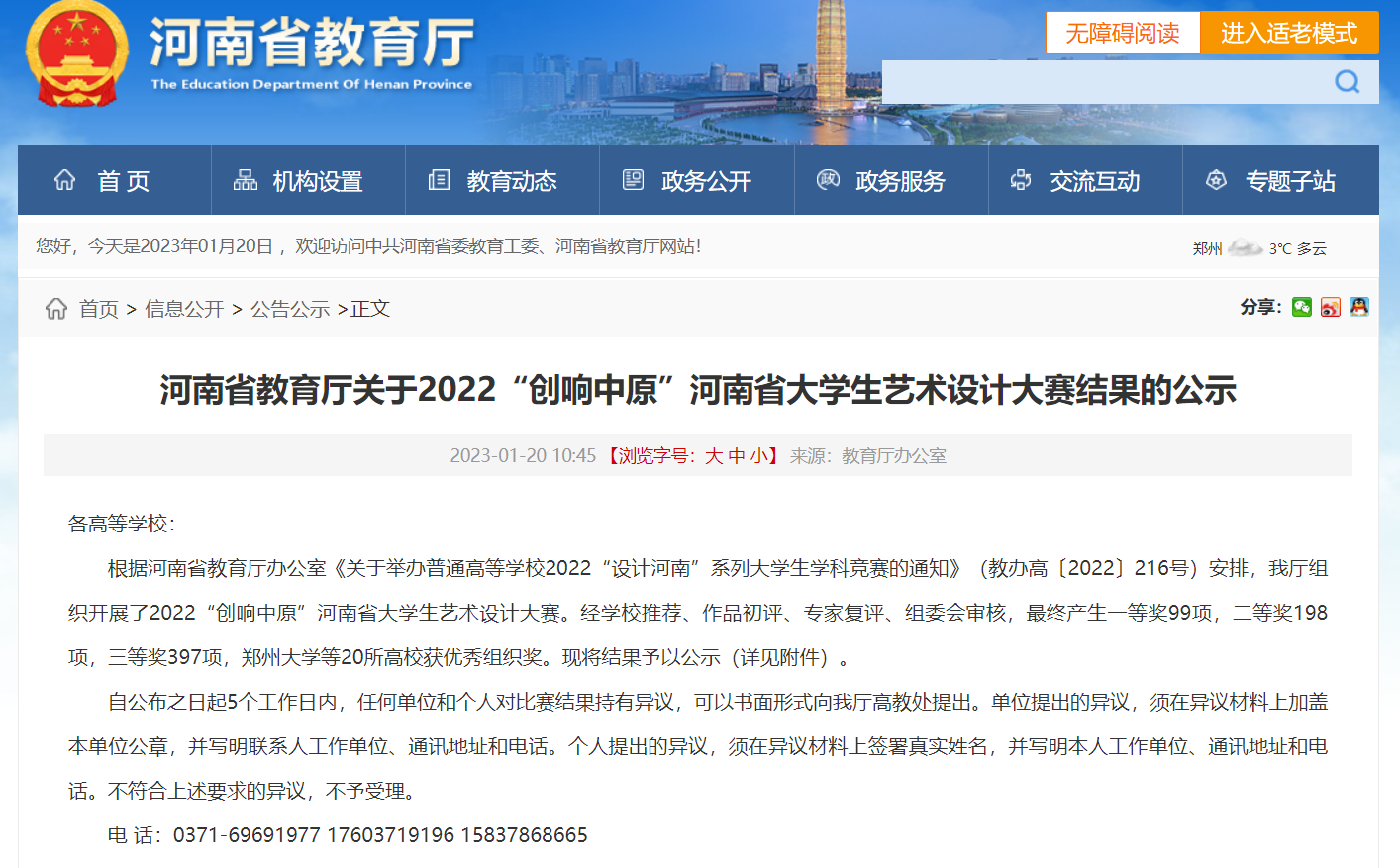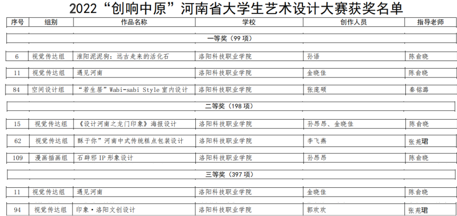 1月20日,由河南省教育厅主办,郑州大学、河南大学联合承办的2022“创响中原”河南省大学生艺术设计大赛结果公示。洛阳科技职业英皇娱乐场