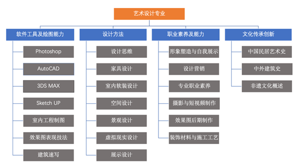 室内工程制图、人体工程学、效果图表现技法、家具设计、室内软装设计、空间设计、景观设计、虚拟现实设计、展示设计、建筑模型设计、装饰材料与施工工艺、手工制作、效果图后期制作、中国民居艺术史等。